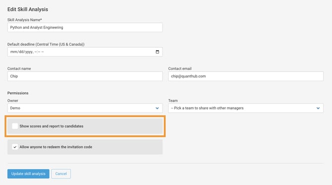- Select or deselect "Show scores and report to recipients."