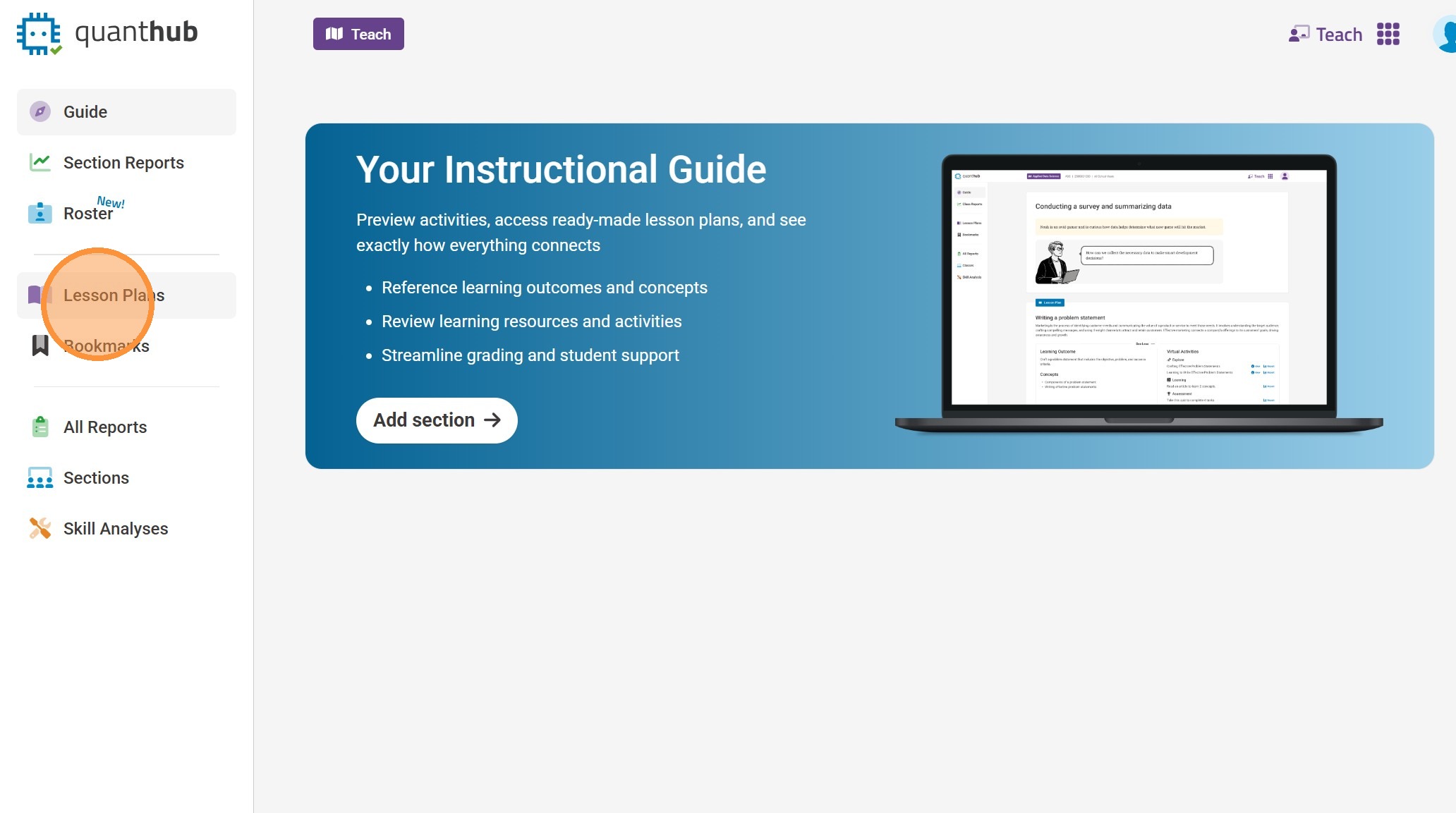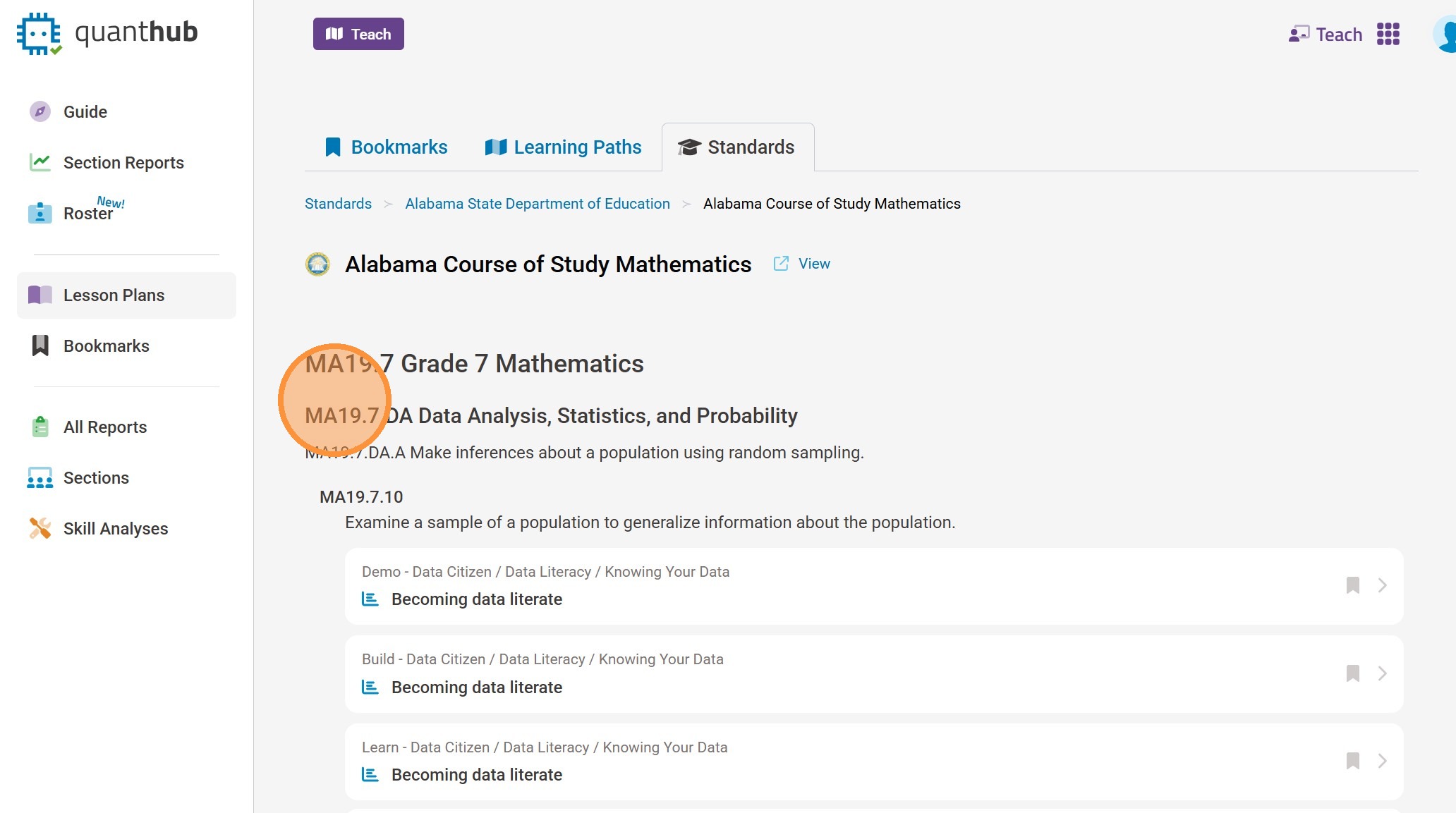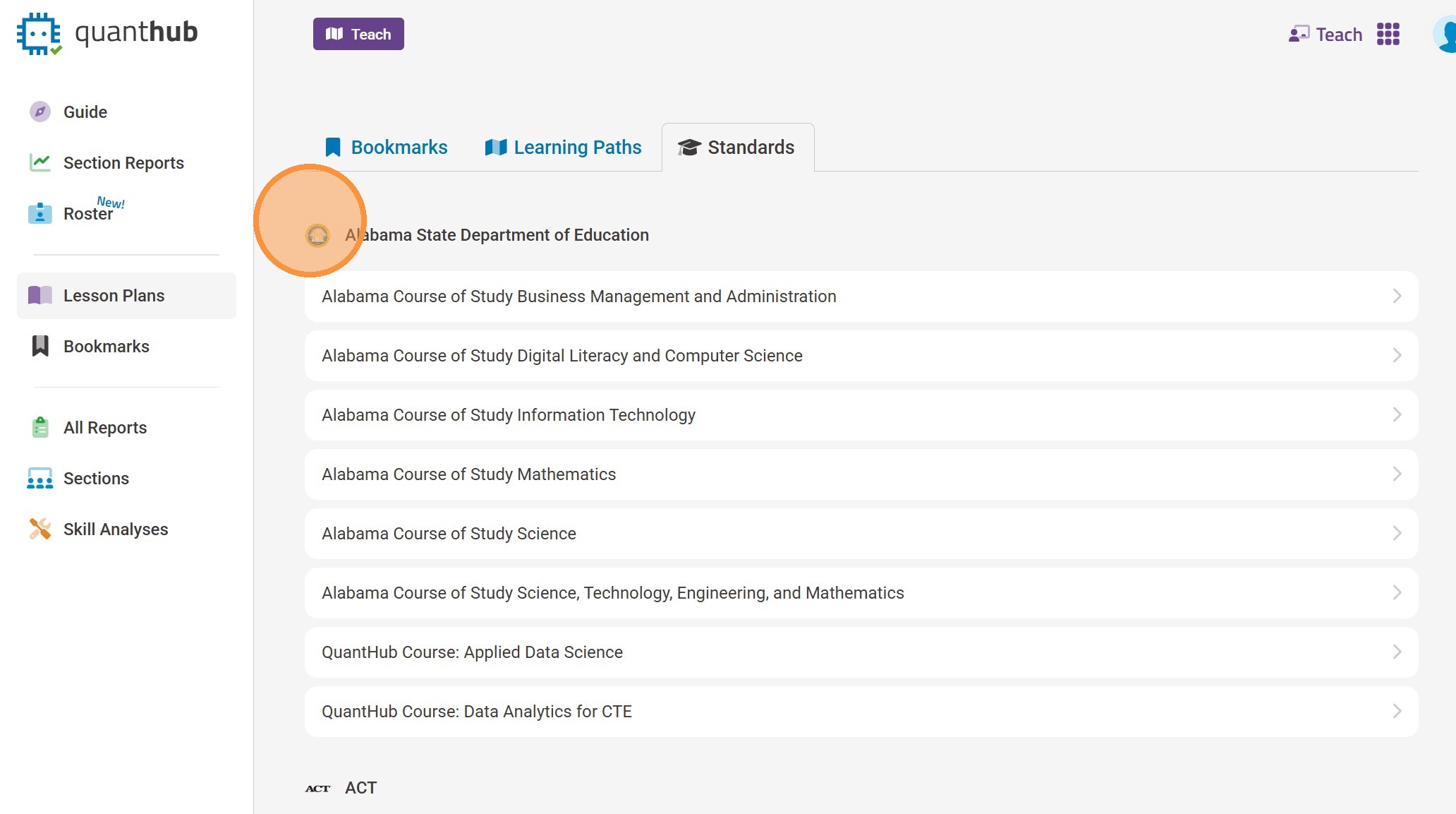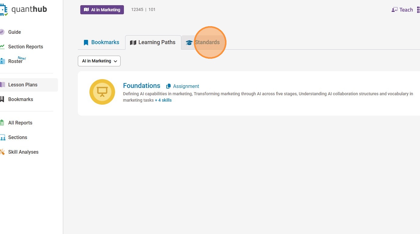 11. To explore which QuantHub skills are related to your standards, navigate to the "nine dot" and select the "teach" icon.