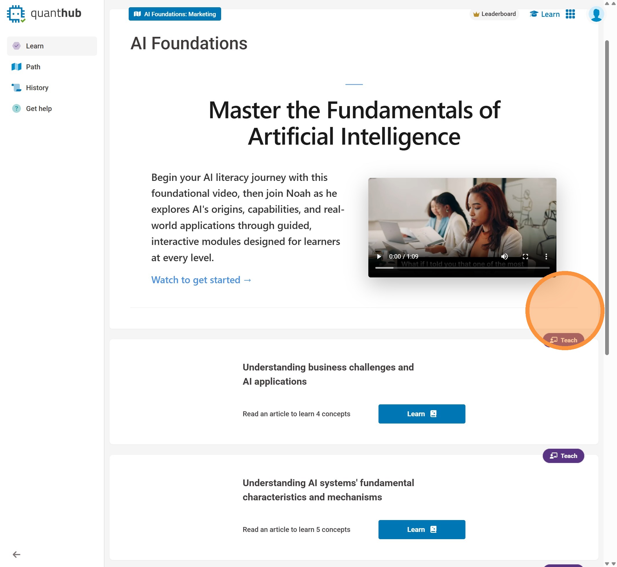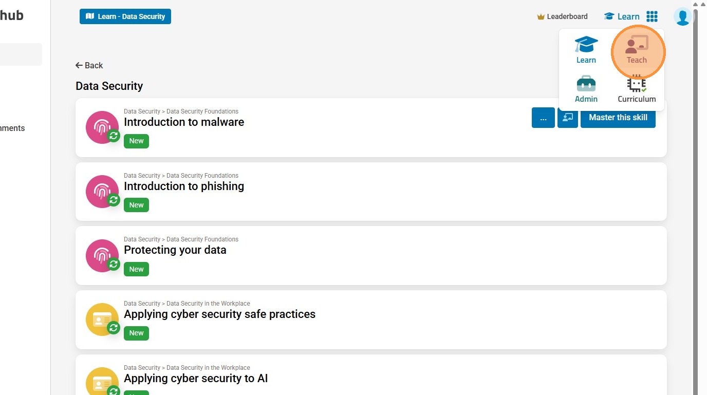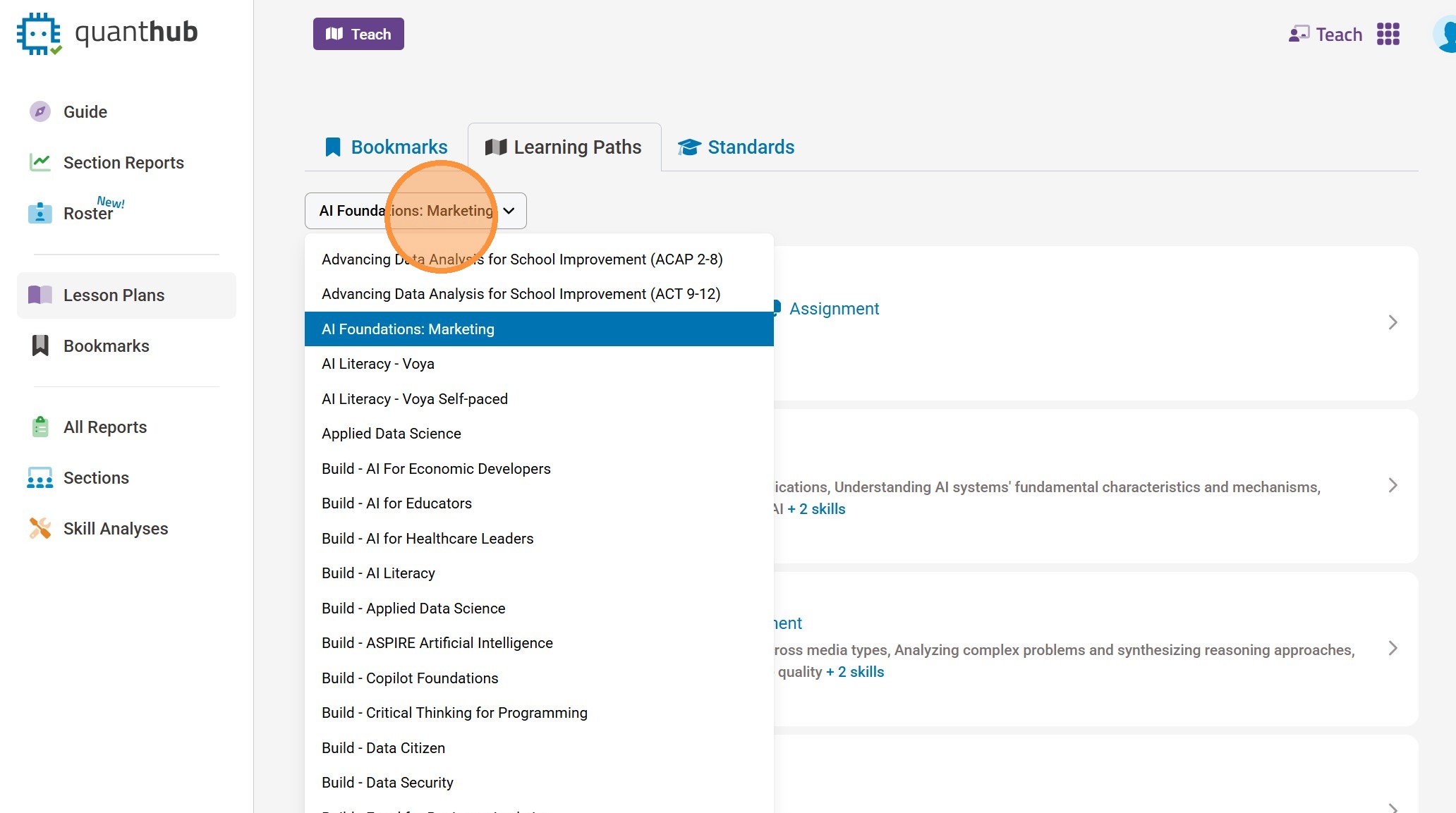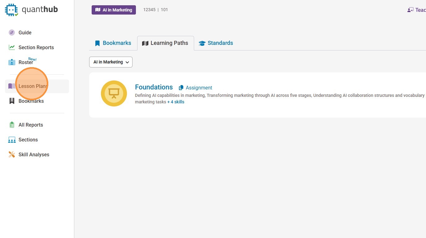11. To explore which QuantHub skills are related to your standards, navigate to the "nine dot" and select the "teach" icon.