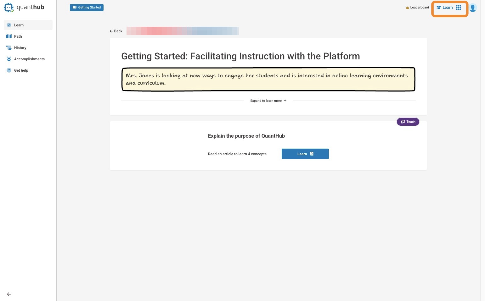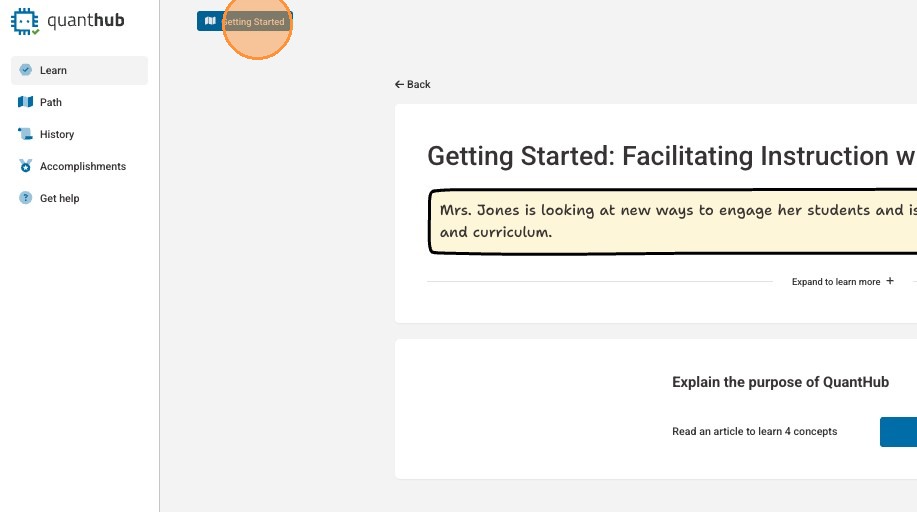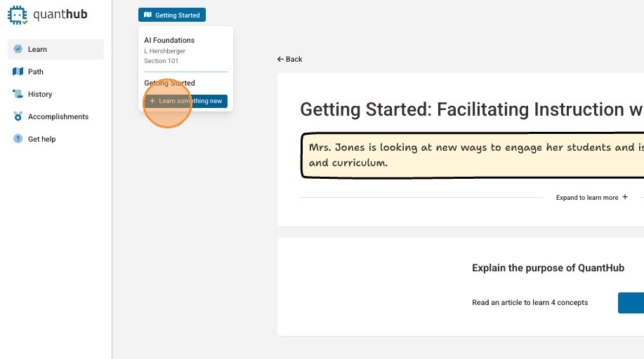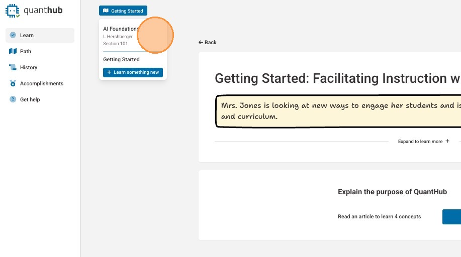 4. You will typically be dropped into your learning path. If you are a teacher, professor, or manager, you can select the nine dot icon and select "Learn" to be taken to QuantHub learning content.