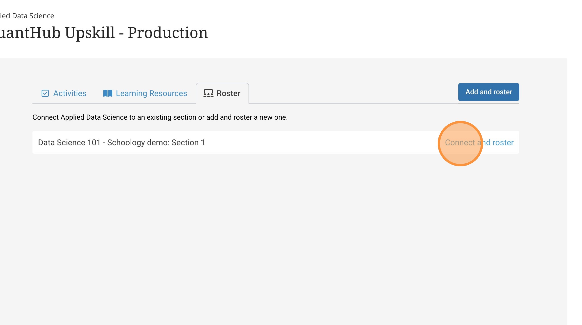22. To roster the already created section select the "Connect and Roster" associated with that section.