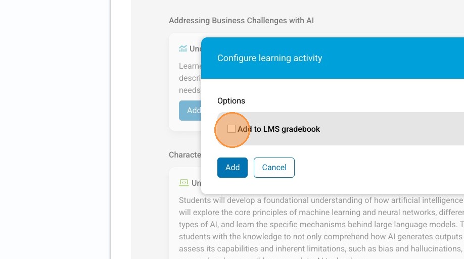 10. Select the "Add to LMS gradebook" field, if you want the grades to be reported in the gradebook.