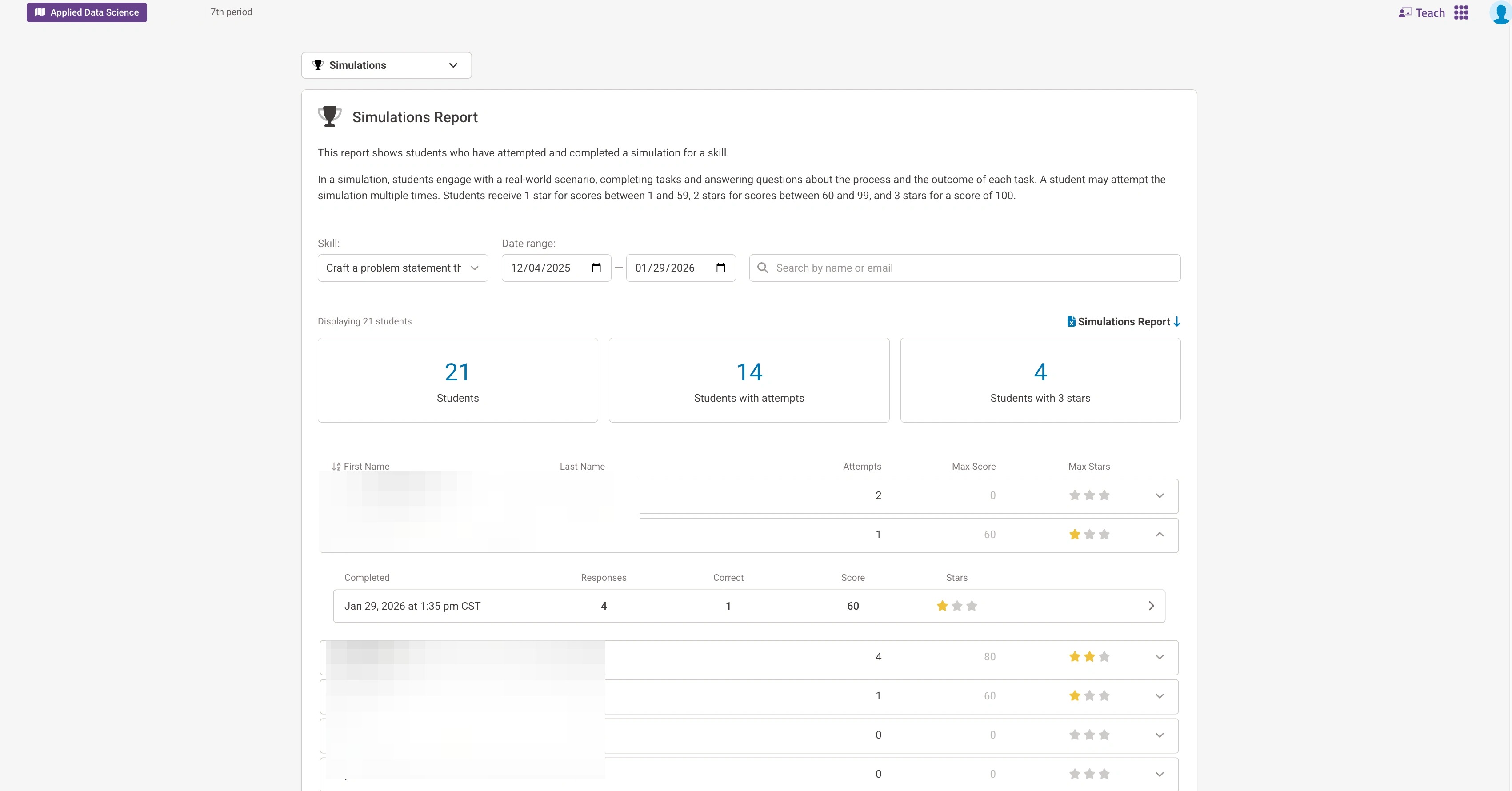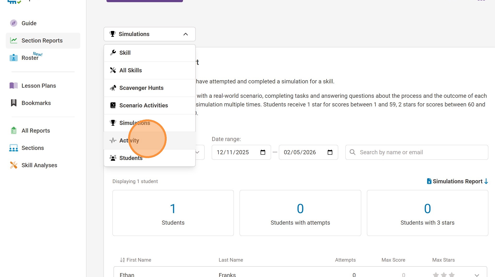 9. After selecting the simulation you want to review, you will be able to see the amount of attempts done by a learner and if they have completed the module. If you want a further breakdown of a learner hit the drop down menu to the right of the row to expand it.