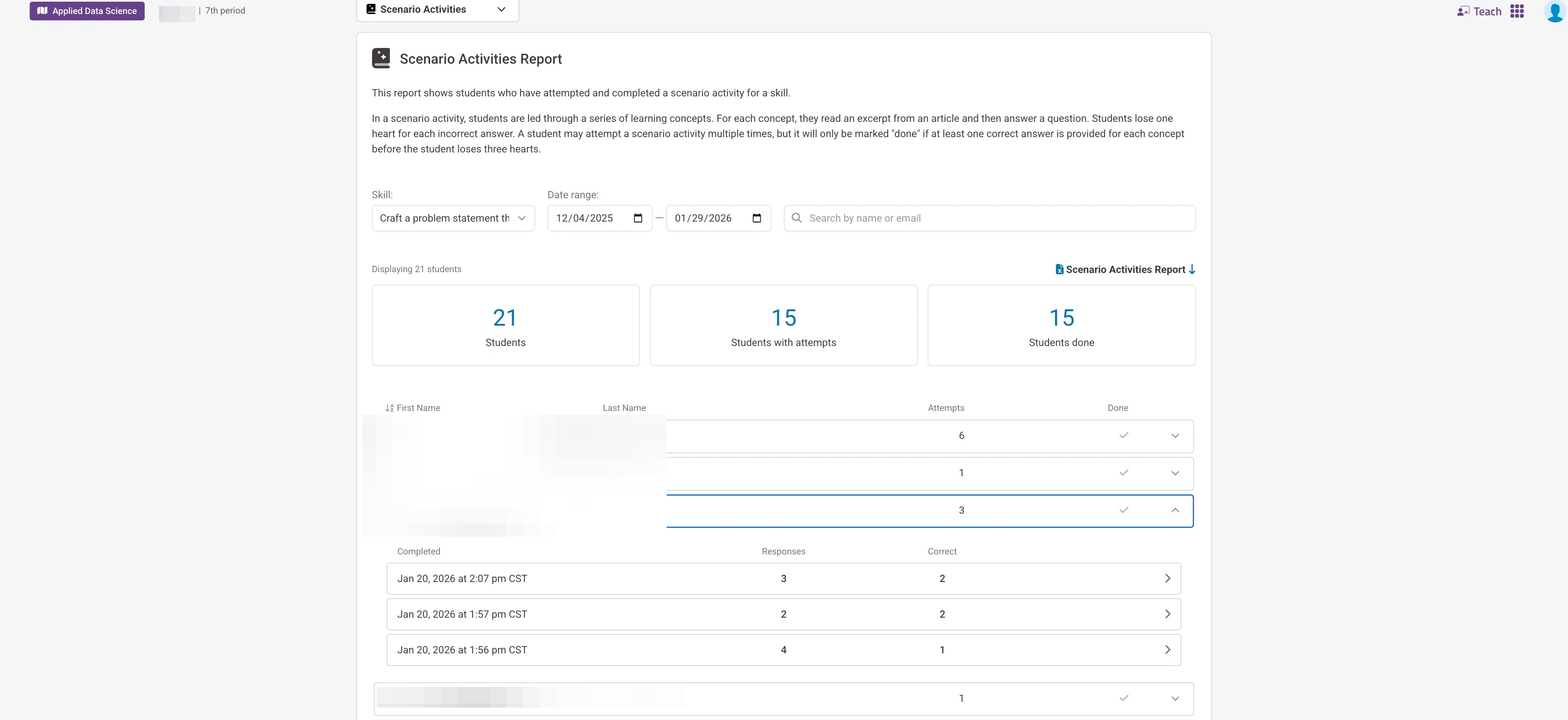 8. After selecting the scenario you want to review, you will be able to see the amount of attempts done by a learner and if they have completed the module. If you want a further breakdown of a learner hit the drop down menu to the right of the row to expand it.