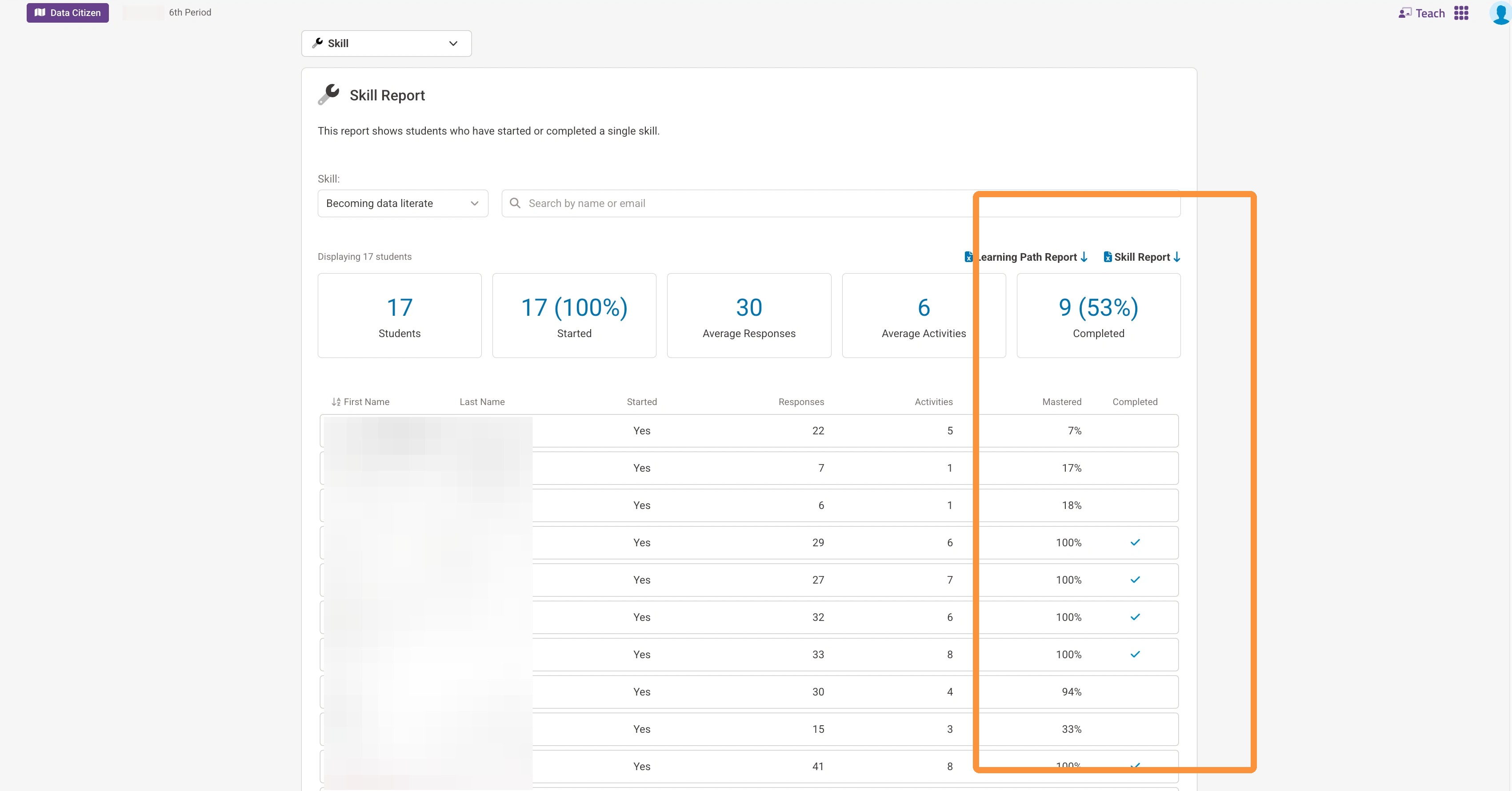 5. After selecting the skill, you will be able to see the percentage of the skill mastered by each learner.