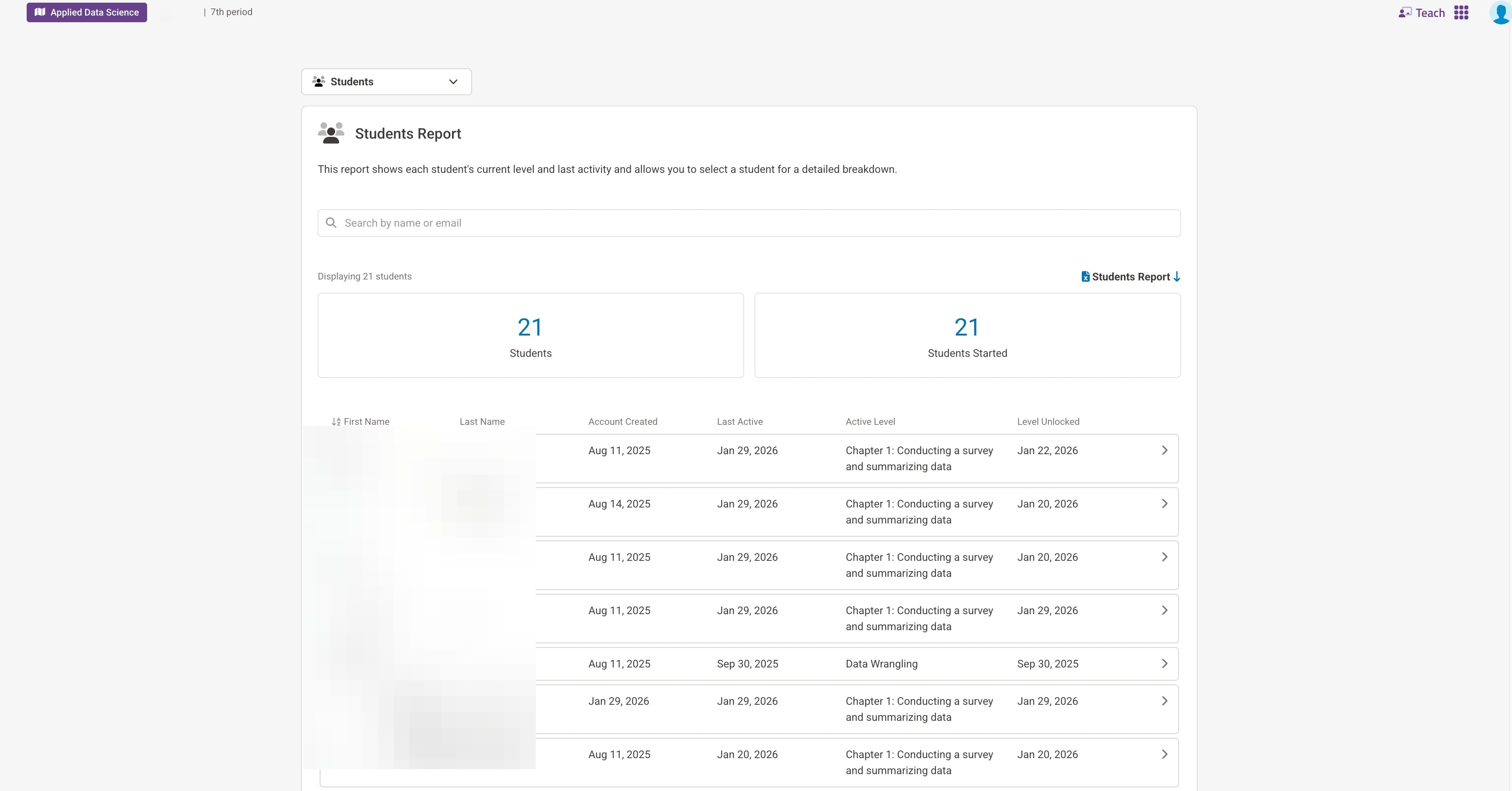 12. To see what individual learners have accomplished most recently, select "Students."