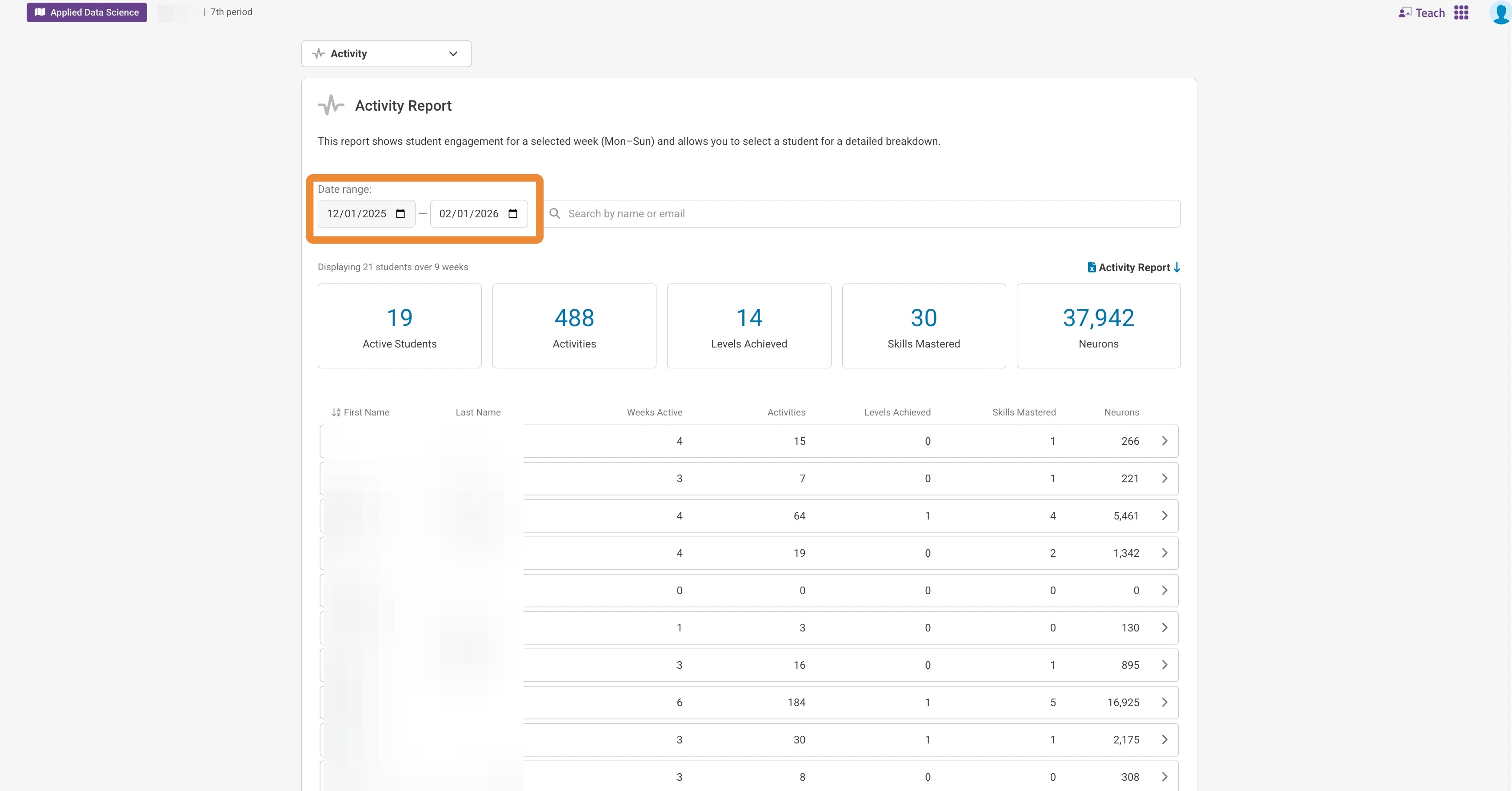 13. This report shows each learner's current level and last activity and allows you to select a learner for a detailed break down of what they have accomplished.