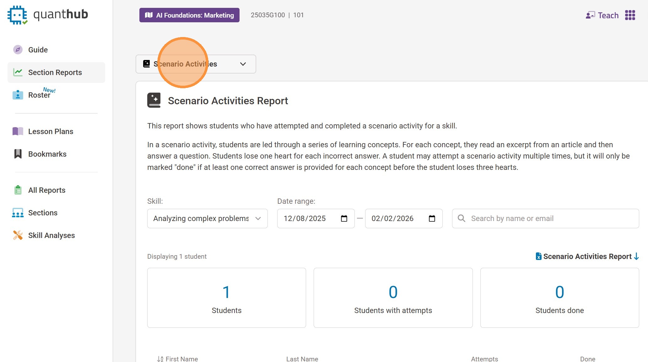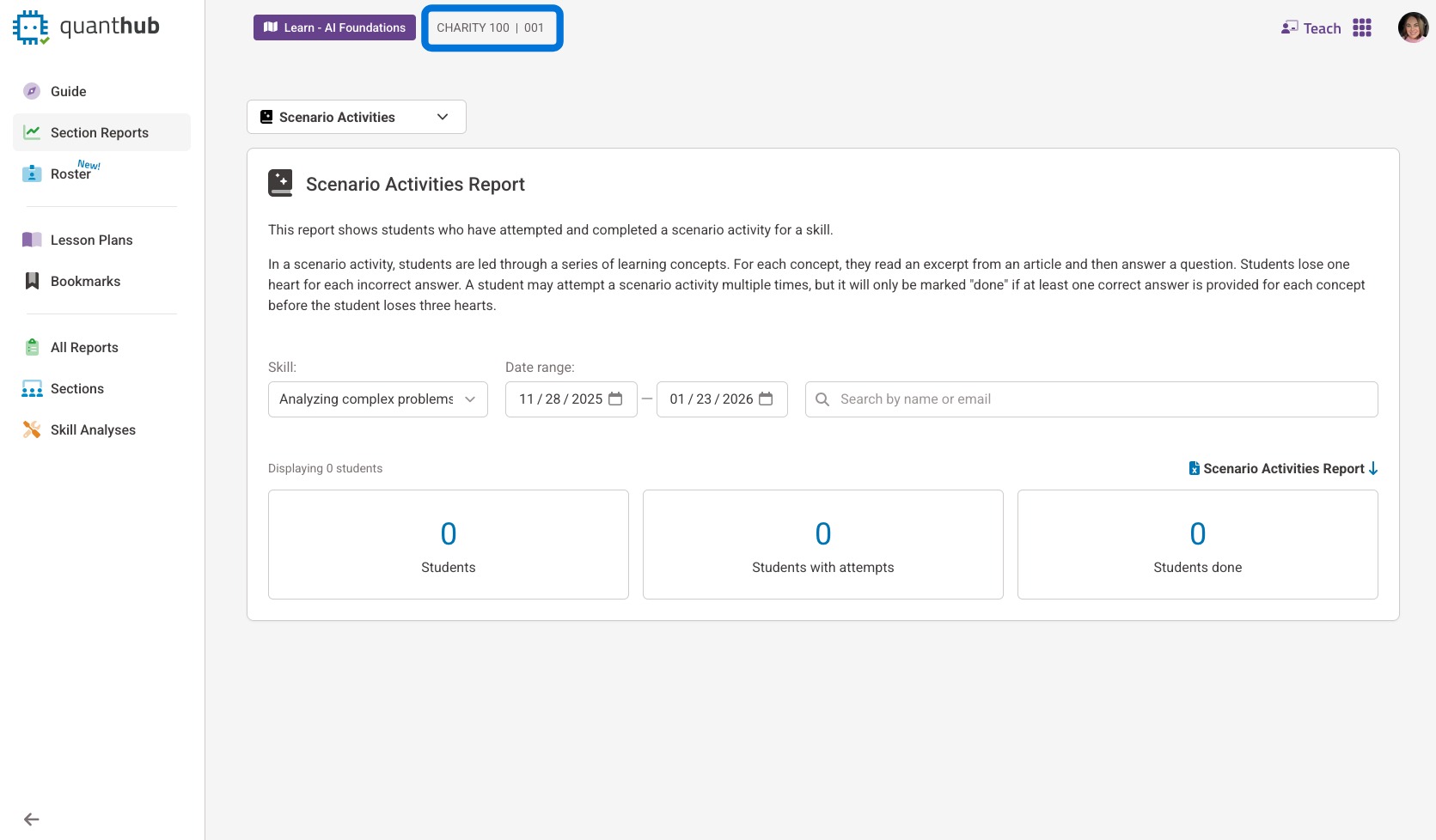 3. The section/class report will be displayed for your currently selected section/class. To change your section/class, select the purple box next to it and choose your desired section/class.