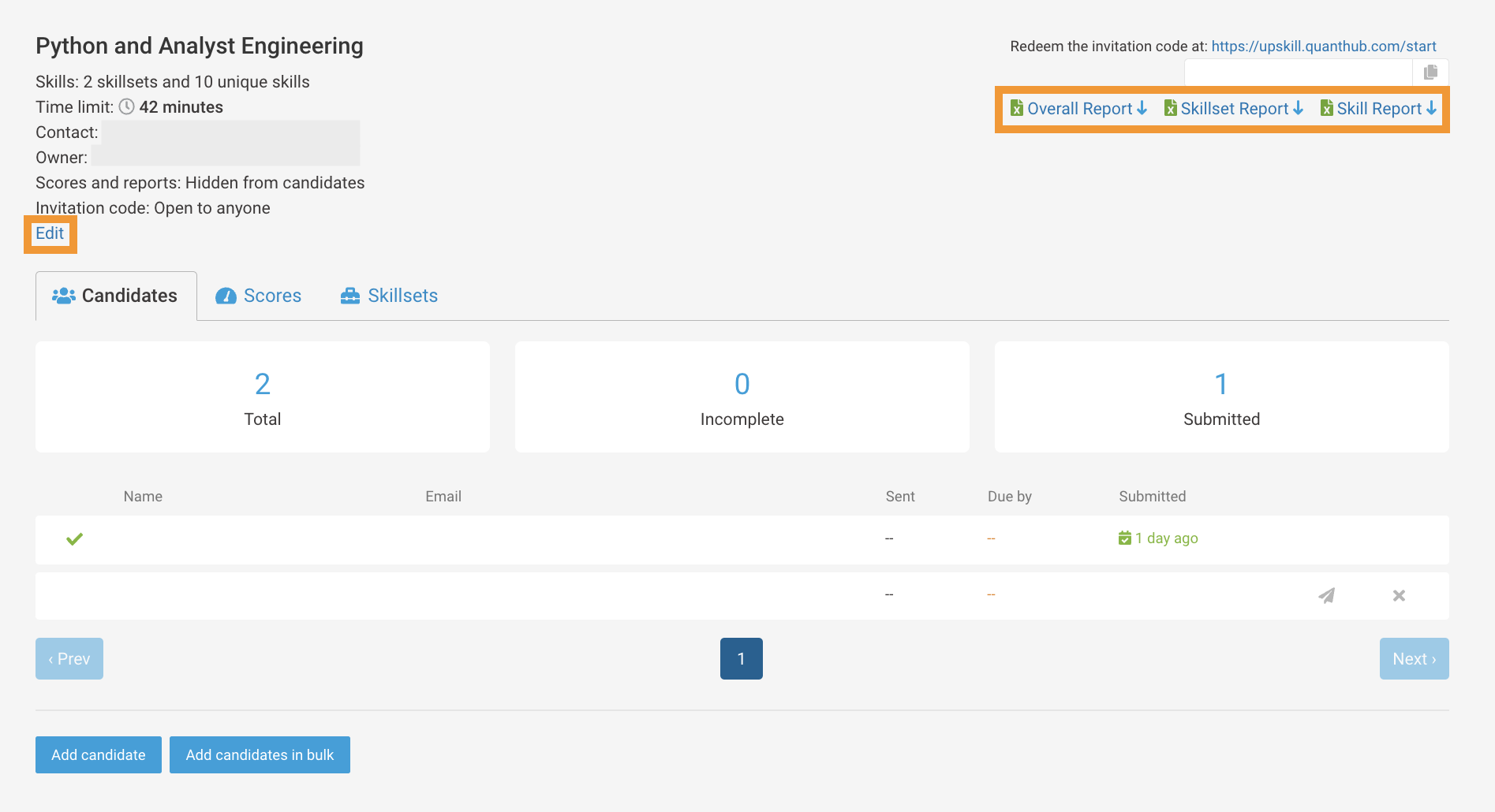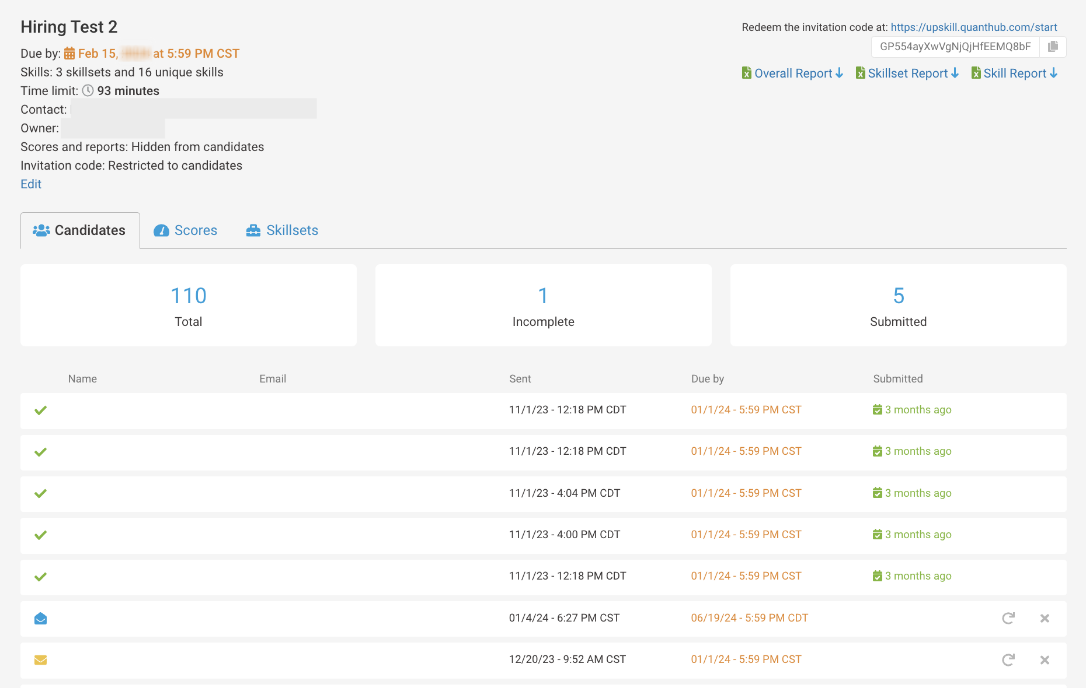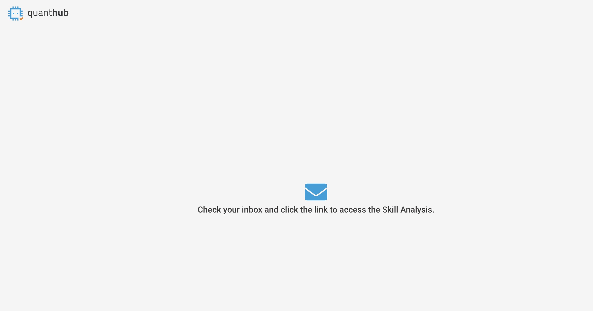 After candidates visit the assessment link (https://upskill.quanthub.com/start), they will enter the invitation code and their email. Afterward, they will receive a confirmation message stating that they have been sent an email invitation to take the test.