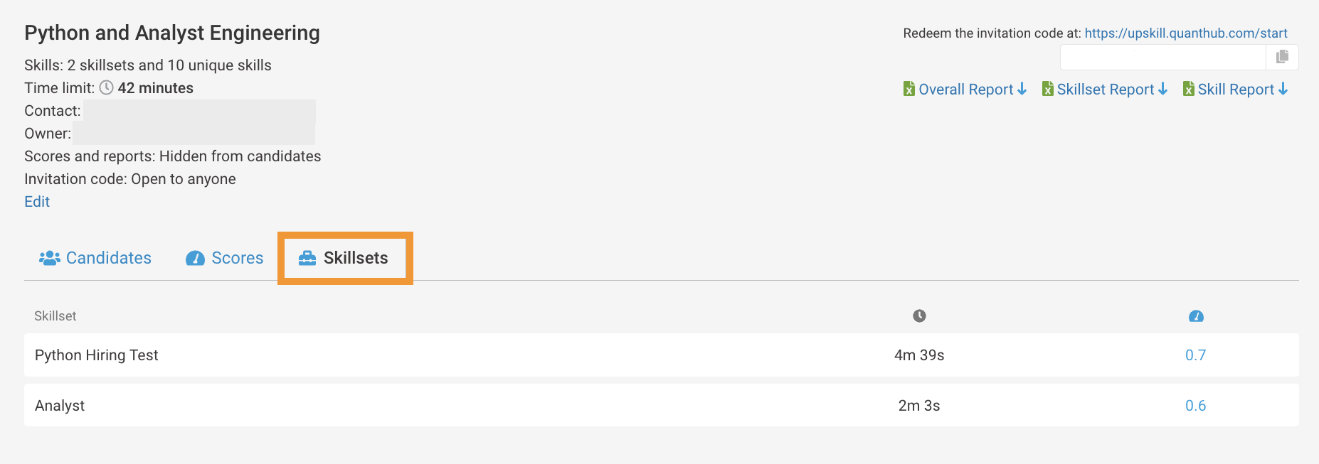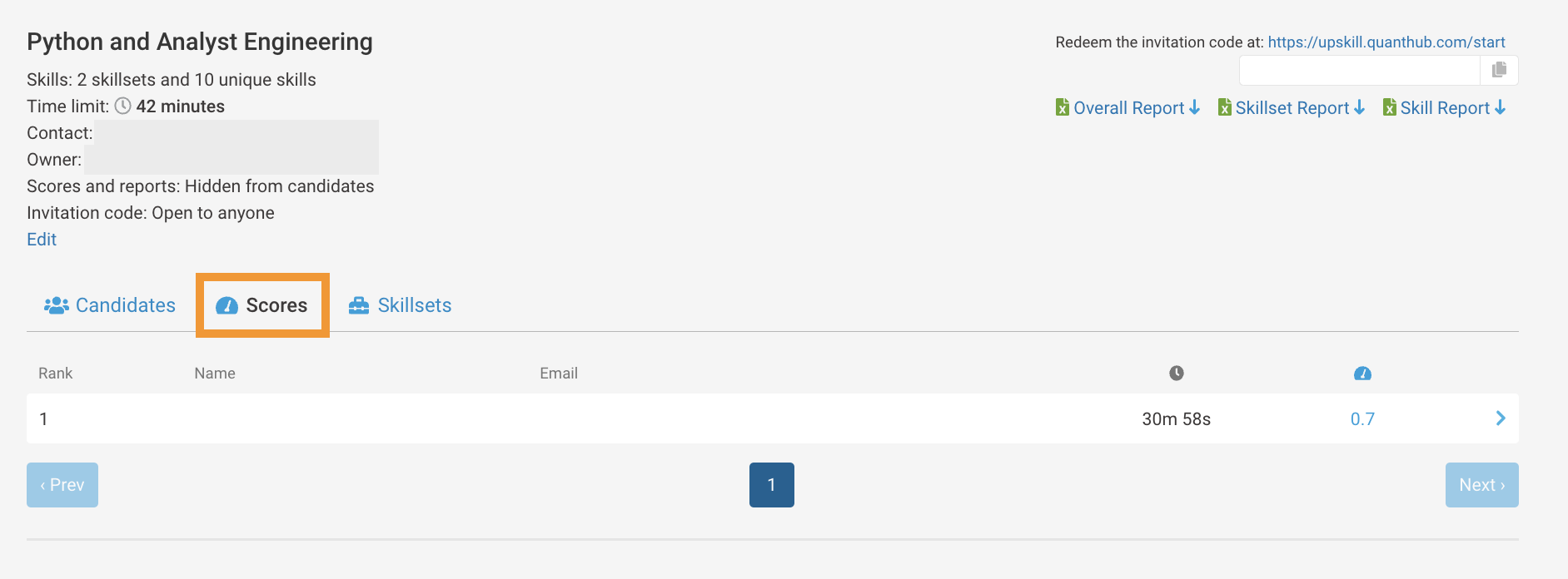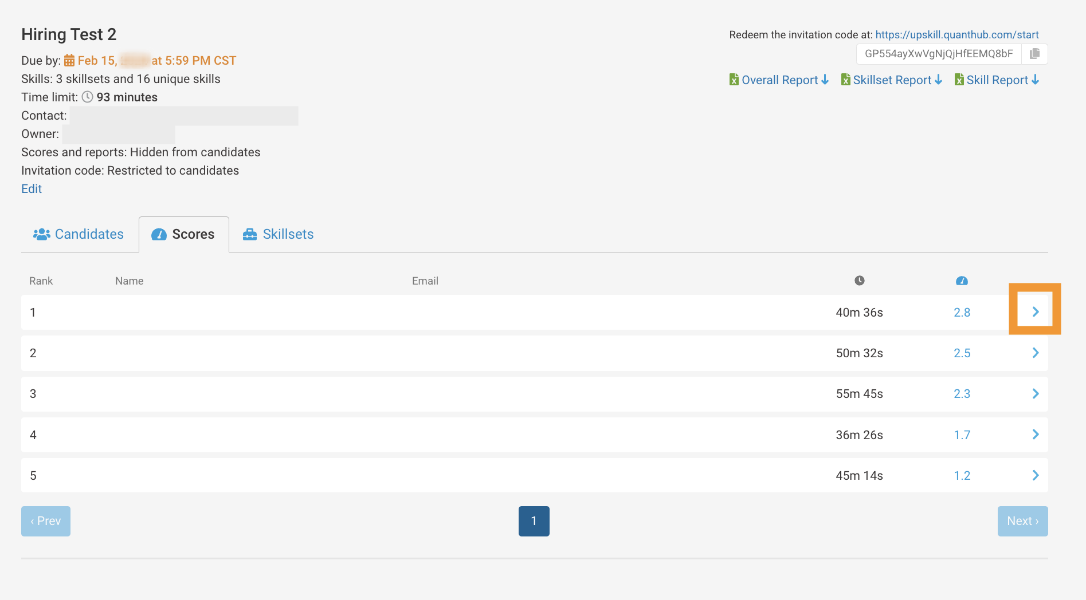 This tab ranks the candidates by their qScore while also showing the time it took them to take the assessment.