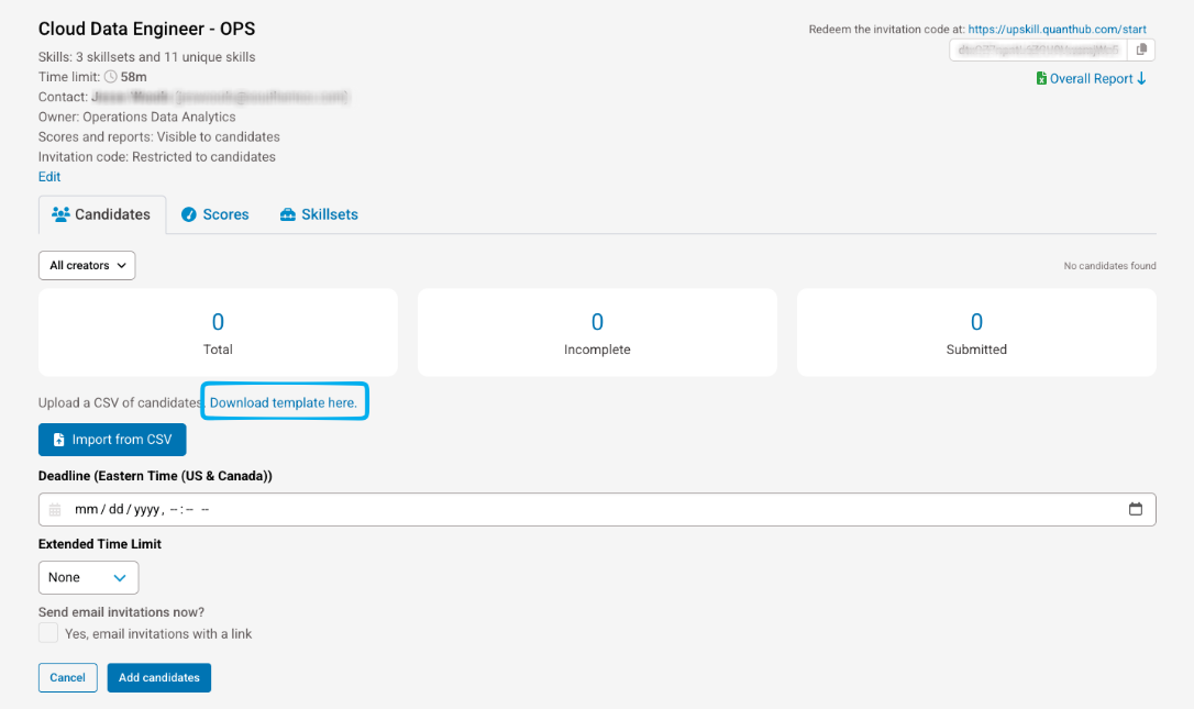 Enter the candidate's email correctly so they can successfully redeem the invitation. This step is necessary for them to be able to access the assessment unless you set it to be an open invite assessment.