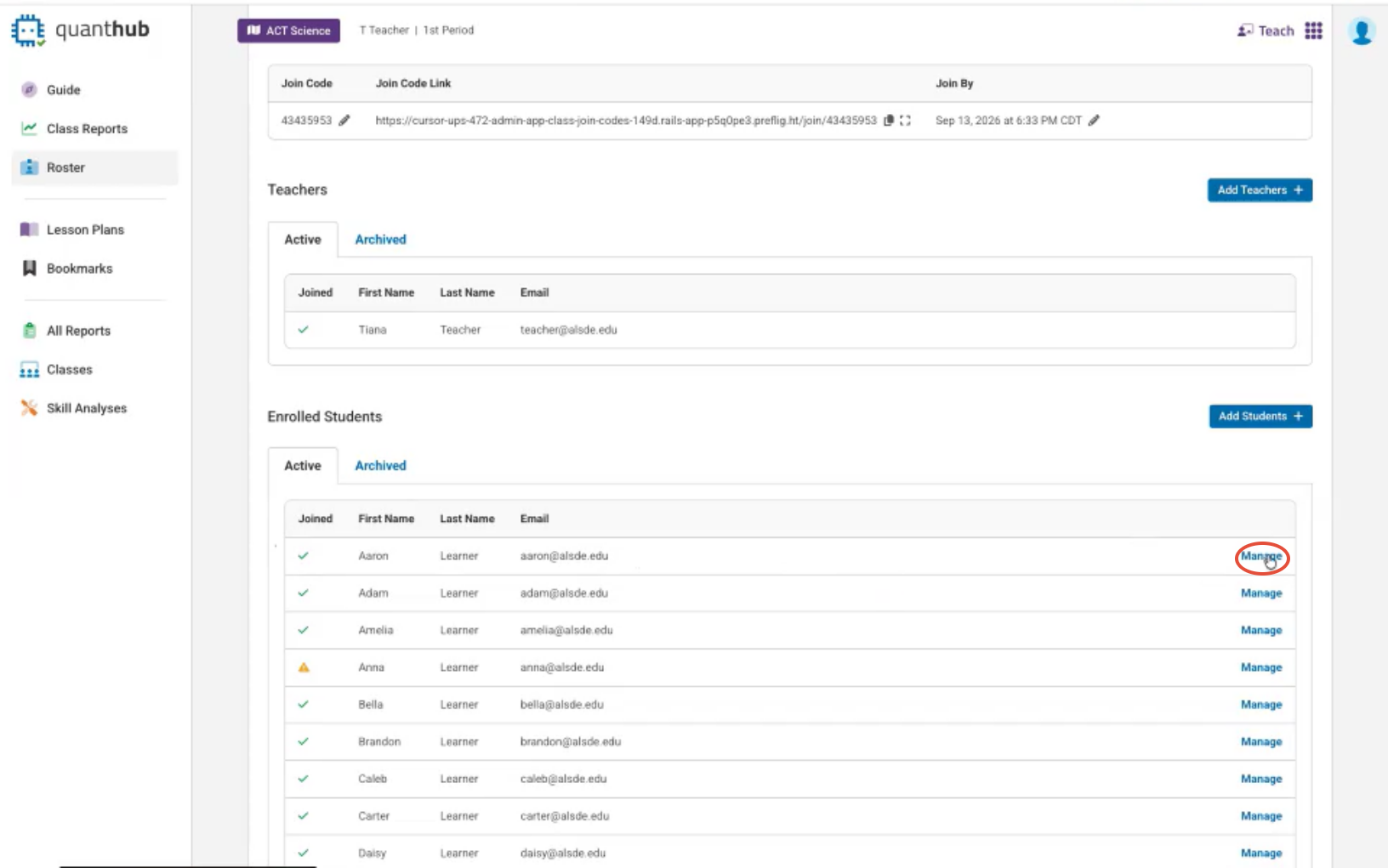 1. Navigate to your roster and select "Manage" for the student who needs a reset.
