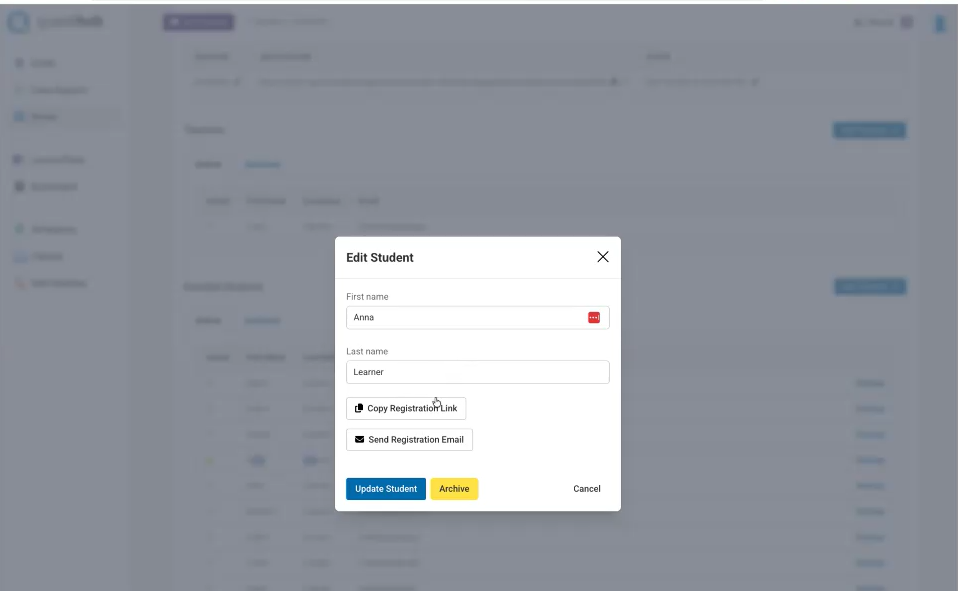 1. Select the student, copy registration link, and share the link with them.